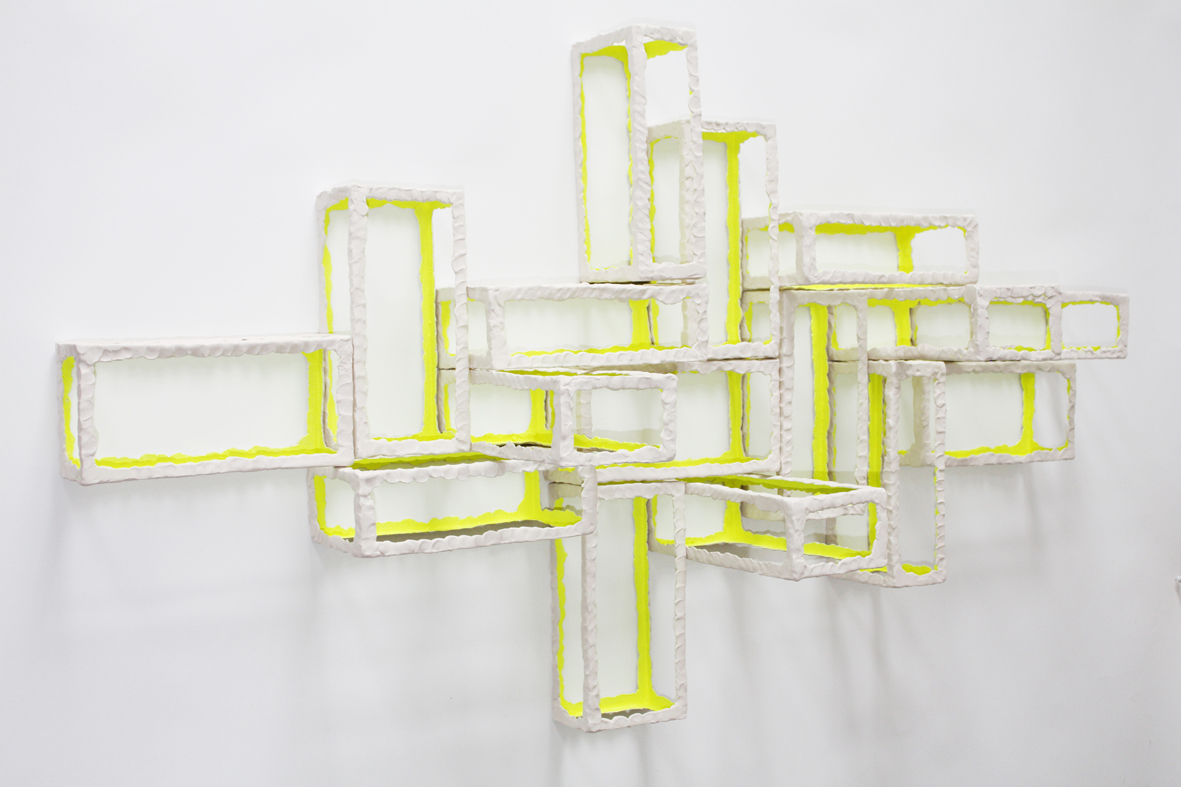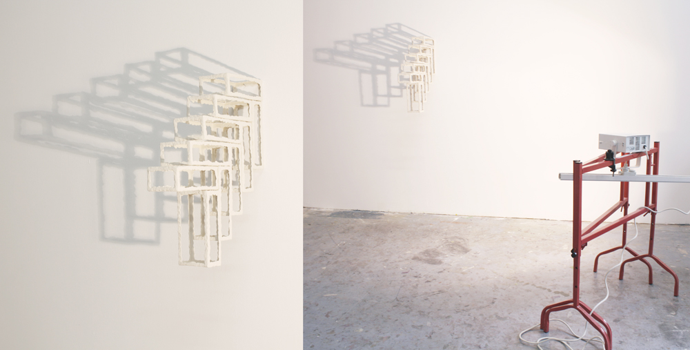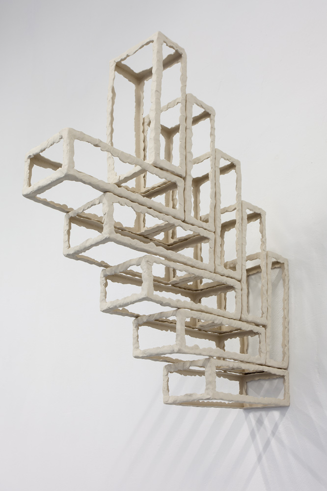 The BRICK series stands in strong contrast to the varied subject matter I approach. I produce this geometric form in multiples and when they are fired, I arrange them in various compositions. Stacked or placed apart, hung in a large cluster or in small groups, this stagnant brick element has captivated my fascination with its endless configuration possibilities. Light and shadow also play an important roll in this body of work, emphasizing the grid structures and adding a skewed dimension.