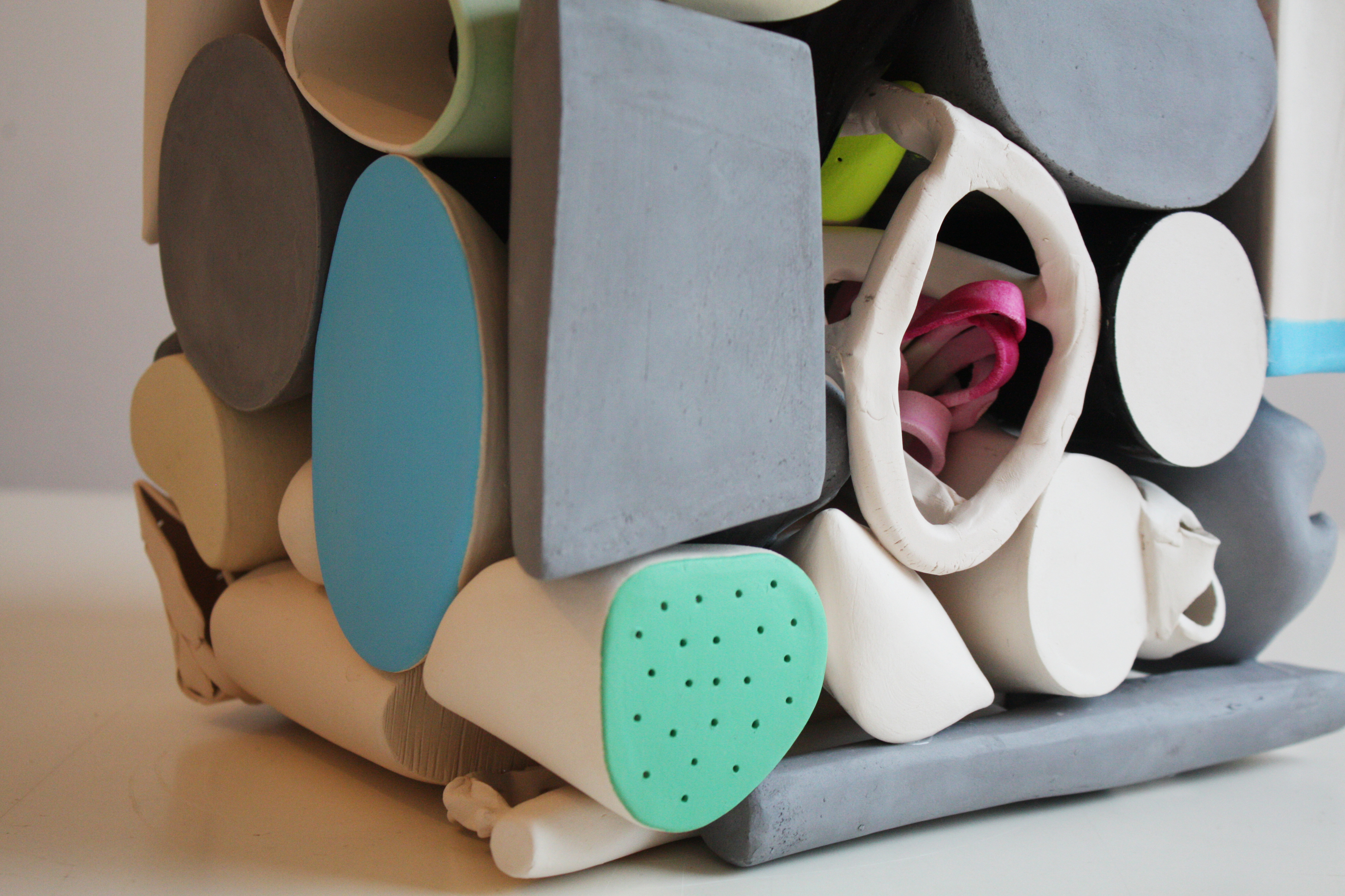 The most prominent of my working processes concentrates on researching form-making through producing intuitive objects with clay and mixed materials. These objects and their spontaneous form express a portrait of a subconscious collection of shapes that I gather by observing my surroundings. Displayed either on their own or in various group configurations, elements of light, color and shadow emphasize the forms and result in inner and outer three dimensional paintings.