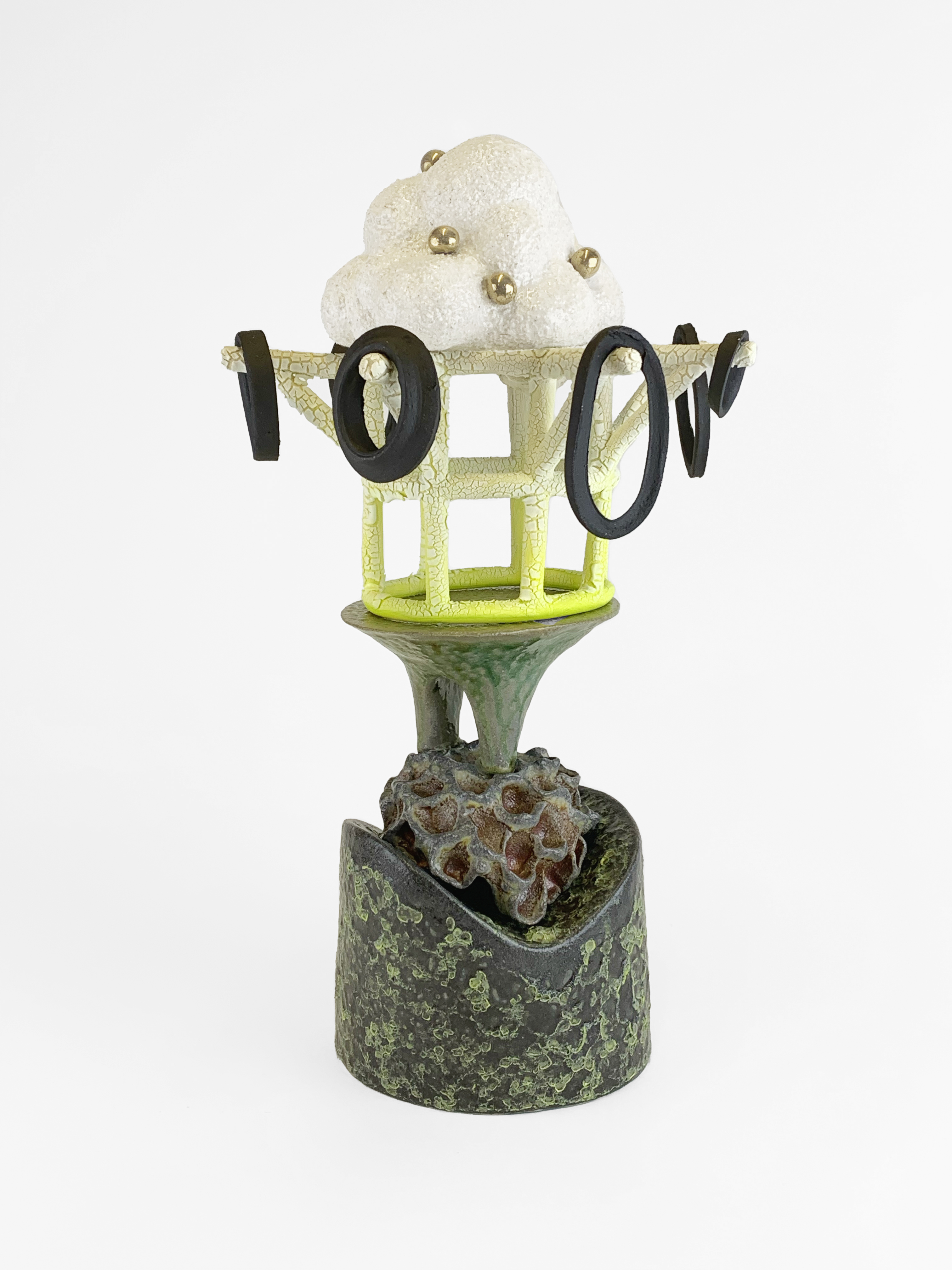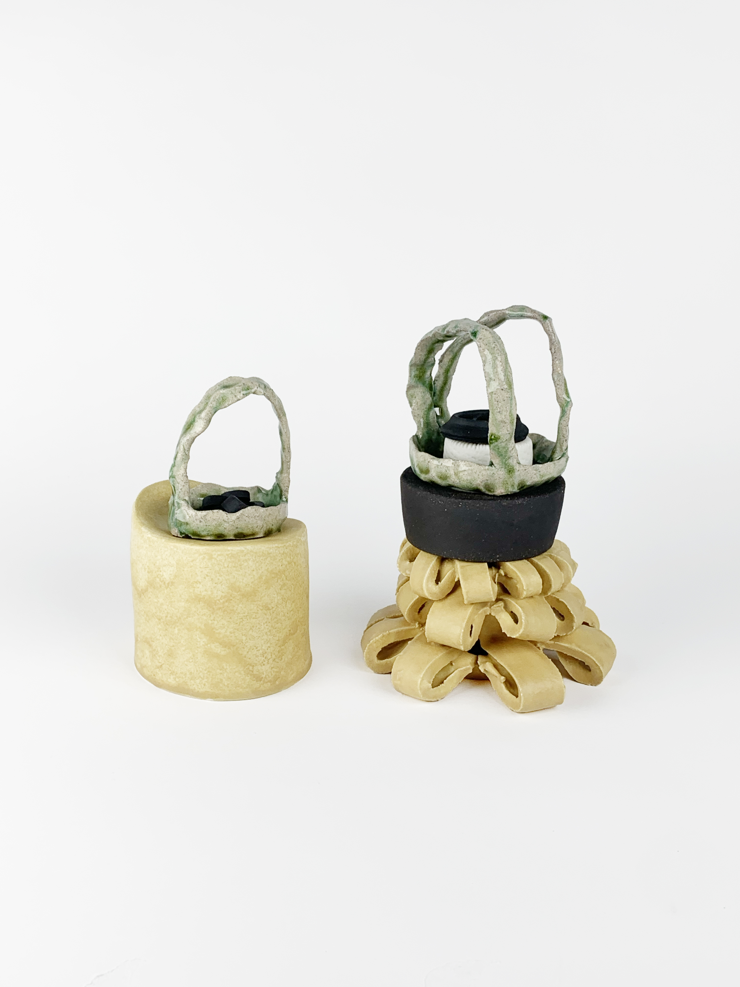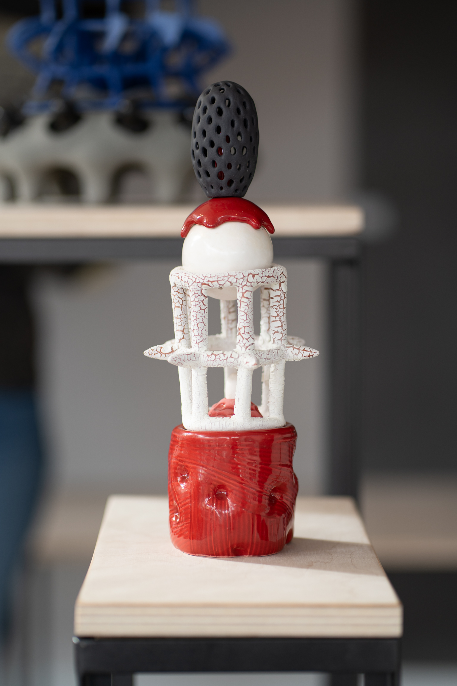 My most recent body of work, one I’ve been composing for a year and a half is centered around abstract ceramic stacked objects. This series, titled Trophies, is a slow accumulation of forms. I cultivate an idea and methodically feed it, drawing from the shapes and structures that surround me. Each element carries its own glaze, firing process, or clay body, creating layered relationships that shift between compositional formats. Approaching clay as a whole material, and using firing methods from low to high within a single sculptural form, I ask how sculpture can unify and include divergent processes, exponentially expanding my opportunities for aesthetic language.