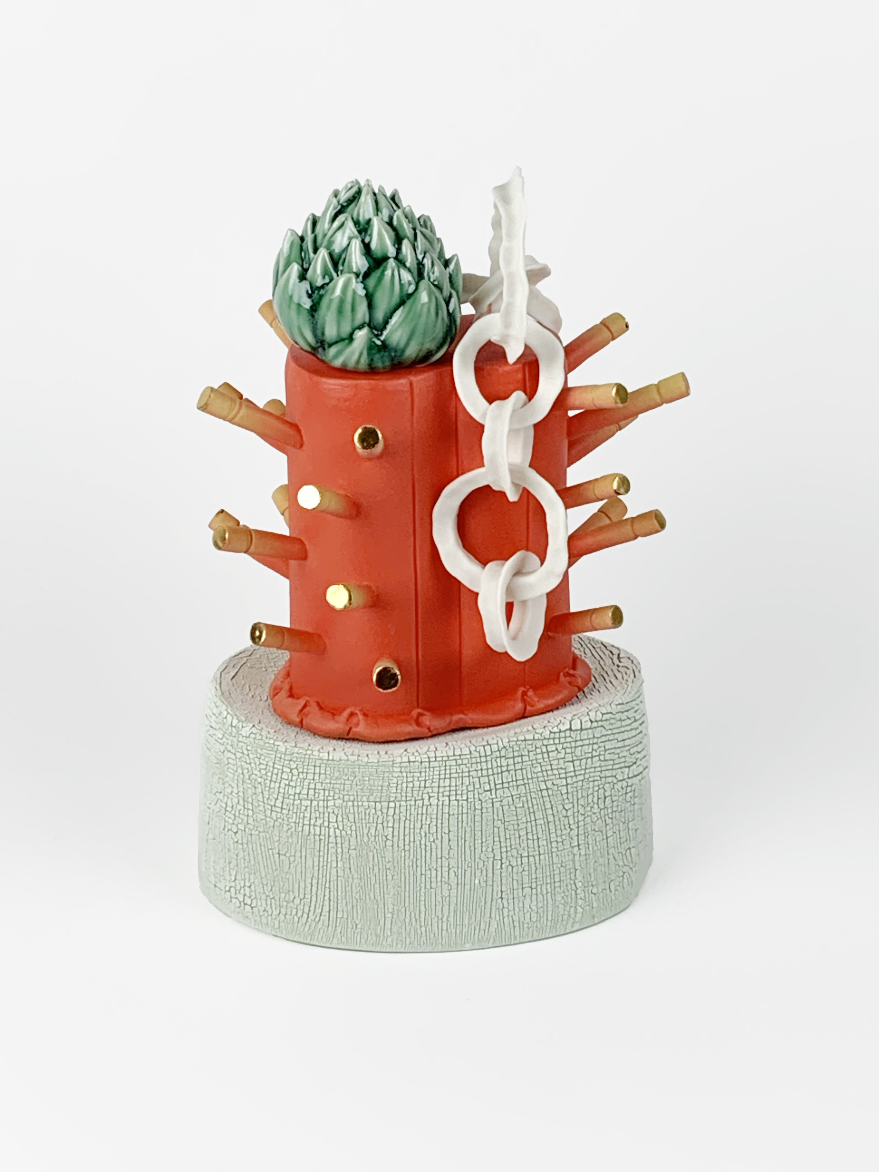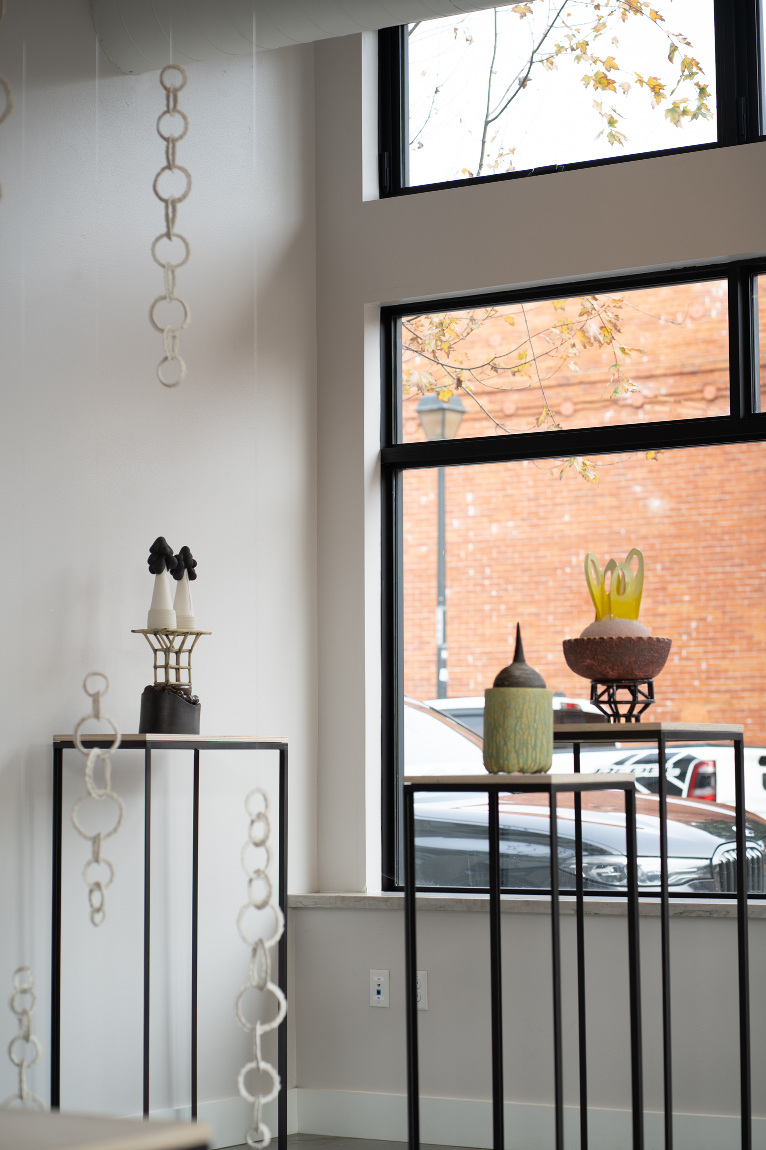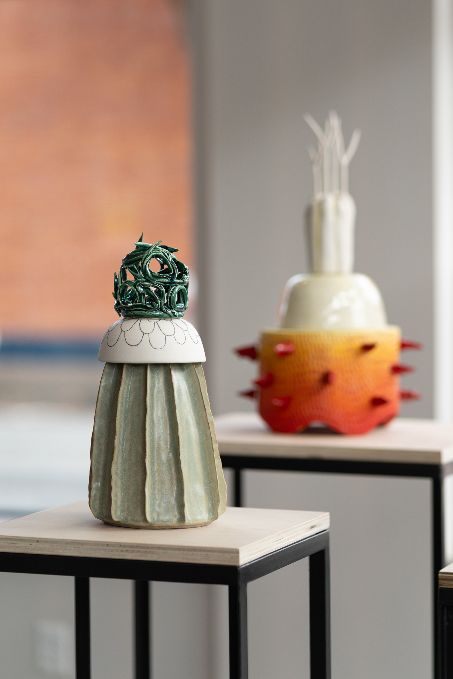 My most recent body of work, one I’ve been composing for a year and a half is centered around abstract ceramic stacked objects. This series, titled Trophies, is a slow accumulation of forms. I cultivate an idea and methodically feed it, drawing from the shapes and structures that surround me. Each element carries its own glaze, firing process, or clay body, creating layered relationships that shift between compositional formats. Approaching clay as a whole material, and using firing methods from low to high within a single sculptural form, I ask how sculpture can unify and include divergent processes, exponentially expanding my opportunities for aesthetic language.